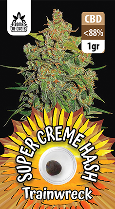 Το Super Crème Hash Trainwreck CBD Είναι μια εντυπωσιακή και ισχυρή ποικιλία από την Aromas of Crete, που προσφέρει τόσο έντονα αποτελέσματα, που θυμίζει την αίσθηση του να έχεις «χτυπηθεί» από εμπορευματικό τρένο! Το προϊόν αυτό συνδυάζει δύο ισχυρά στελέχη για να δημιουργήσει μια μοναδική εμπειρία με γλυκό άρωμα λεμονιού και πικάντικο πεύκο.
